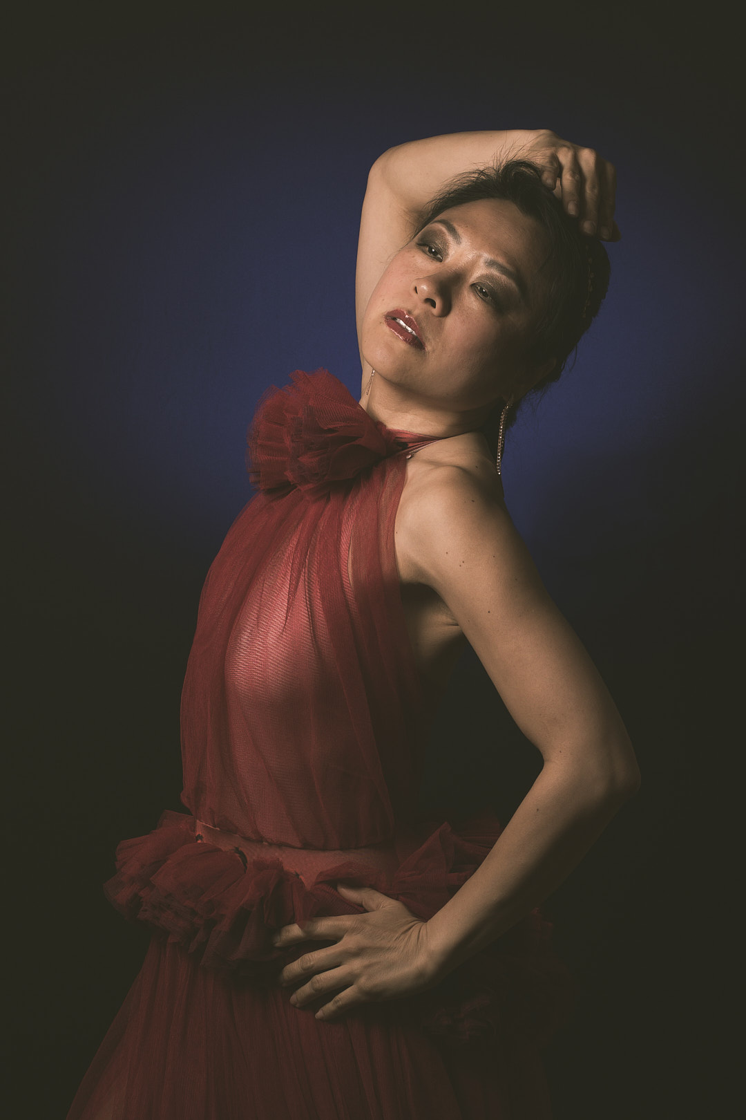 Lady in red: #Porträt–#Shooting mit der wongwolke. Schwarzer Hintergrund mit farbigen #Blitz in Blau getaucht.
